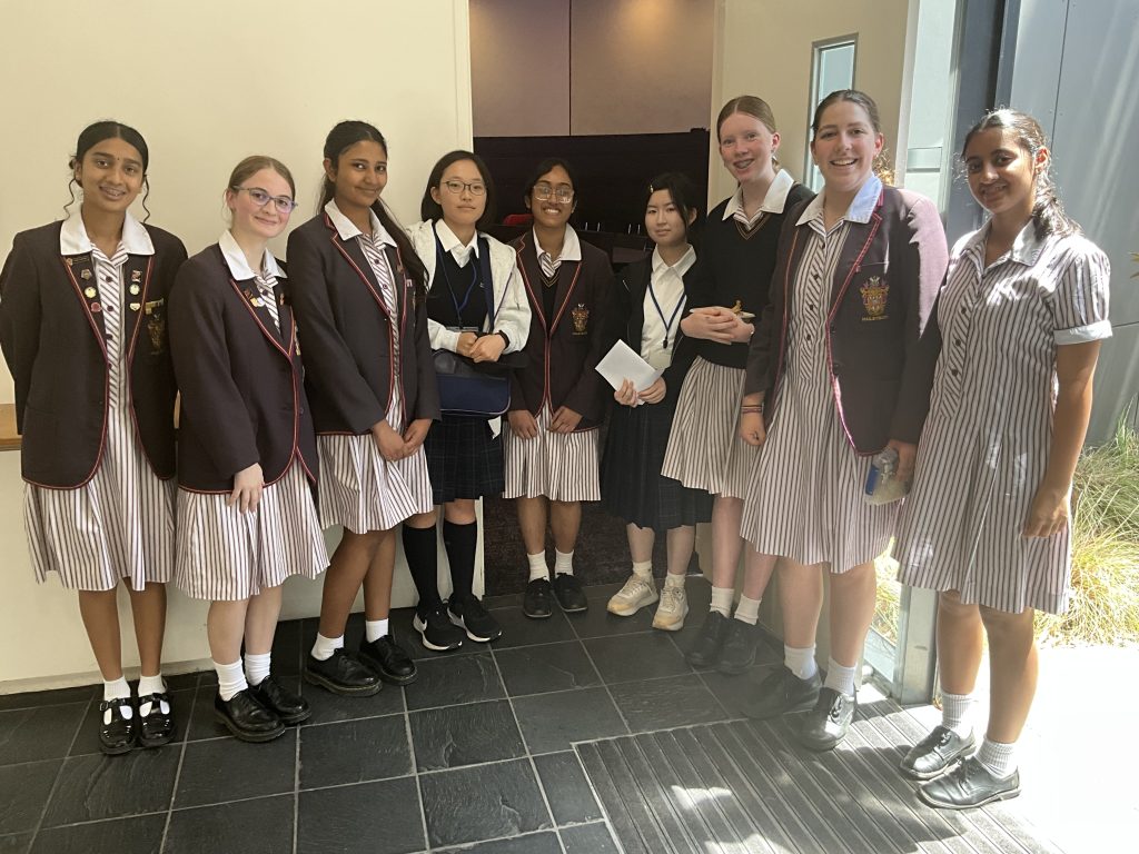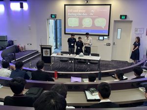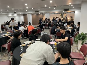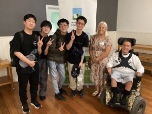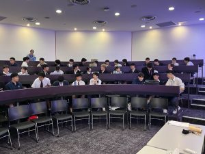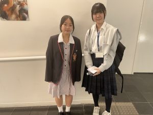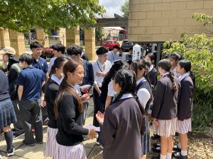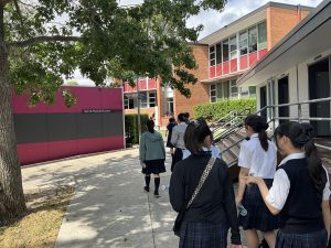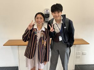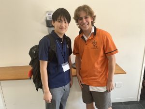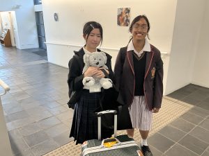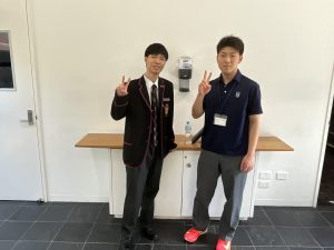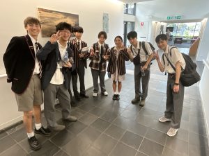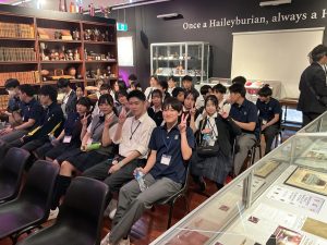 ホームステイ組はヘイルベリーへ到着、レセプションホールで歓迎会が開かれ、本校からも代表がお礼の挨拶をしました。その後、ヘイルベリーの歴史が展示された会場へ行き、話を聞きました。その中でF1レーサーのオスカーピエストリがヘイルベリー出身という話があり、F1好きの生徒たちは大喜びしていました。そのあとは、日本の学年で言うと中学2年生にあたる生徒が敷地内を案内してくました。この中学生たちは選択科目として日本語を勉強している生徒たちで、日本語の授業の一環として案内、本校の生徒たちがおねいさん、お兄さんになり、日本語や日本ことを教えてあげていました。
