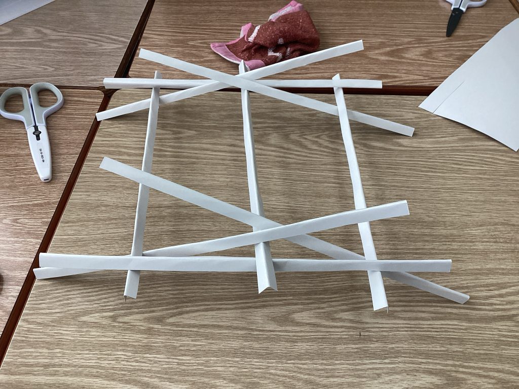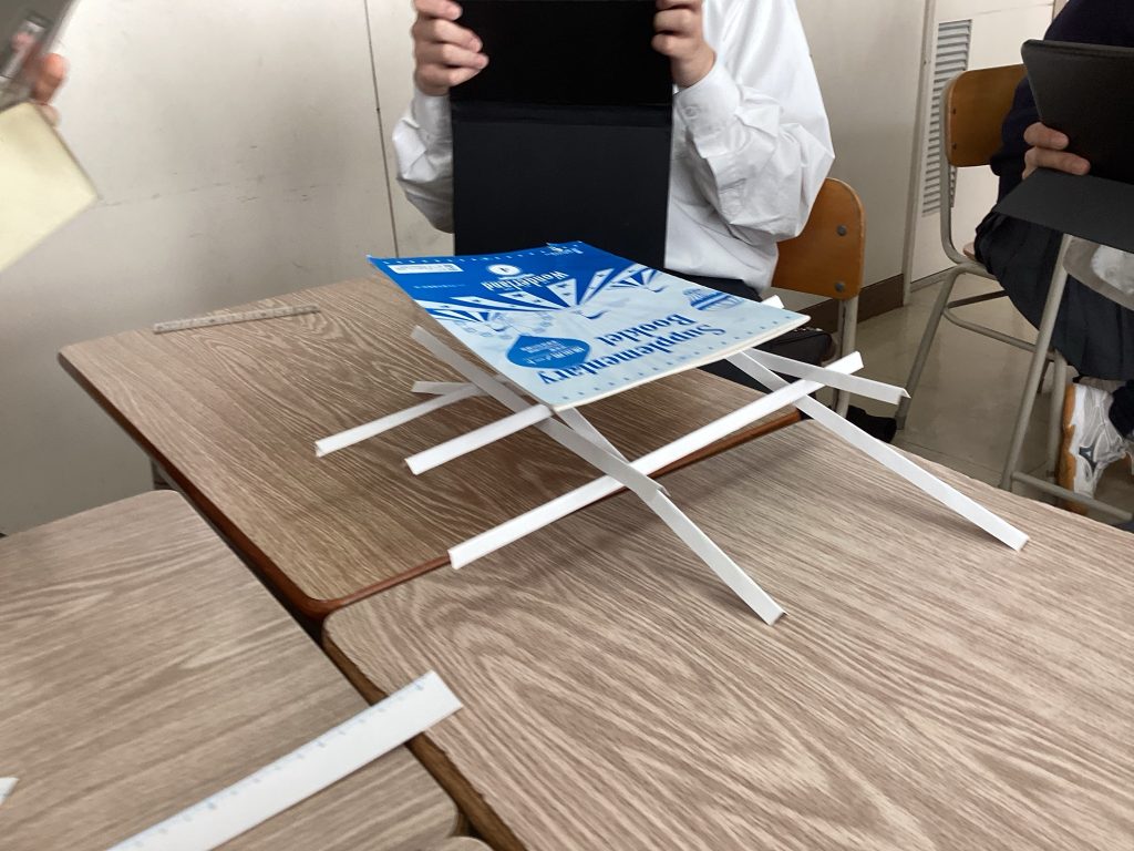 今回生徒達が取り組んだ内容は、厚紙から9本の柱を切り取り、その柱を摩擦力で組み合わせて自立する橋を造るというものです。製作時間や作成した橋がどのくらいの負荷まで耐えうるかなどで評価を行いました。
