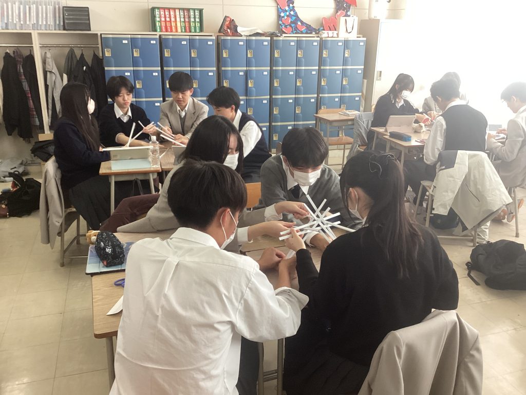 今回生徒達が取り組んだ内容は、厚紙から9本の柱を切り取り、その柱を摩擦力で組み合わせて自立する橋を造るというものです。製作時間や作成した橋がどのくらいの負荷まで耐えうるかなどで評価を行いました。