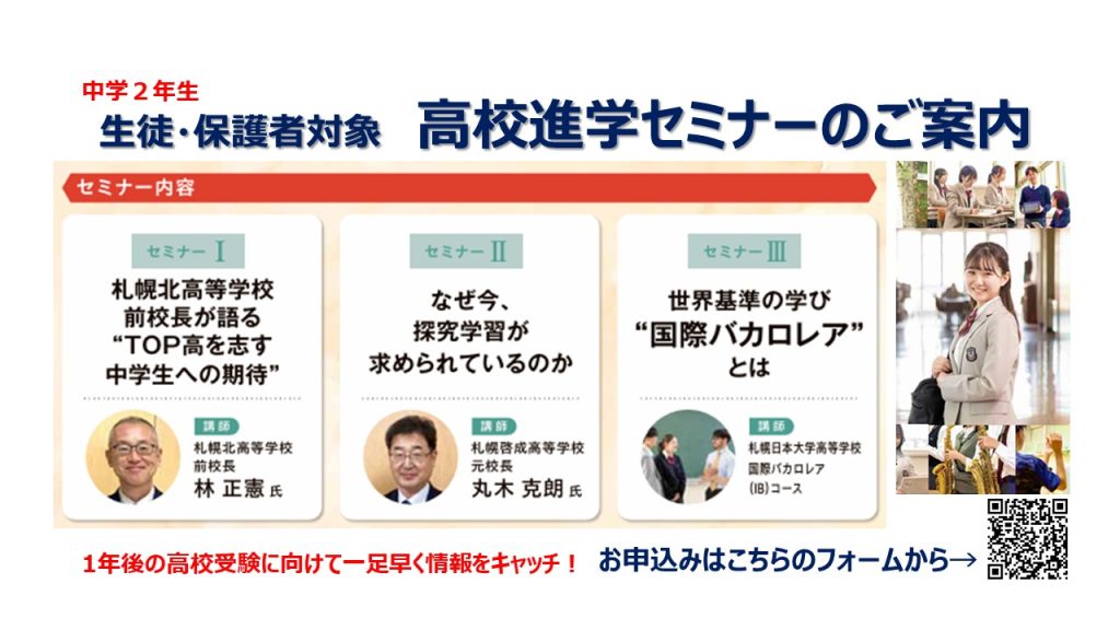 2月22日(日)、ホテルポールスター札幌にて中学校2年生の生徒・保護者を対象に高校進学セミナーを開催いたします。当日は、札幌北高校前校長の林先生と札幌啓成高校元校長の丸木先生を講師にお迎えし、高校選択に向けての貴重な情報をいただける機会となっています。また、今話題を集めている”探究学習”と”国際バカロレア”についても紹介する内容となっていますので、ぜひお役立ていただければと思います。お申し込みはこちらのフォームからとなっていますので、ぜひ多くの皆様のご来場をお待ちしております。
