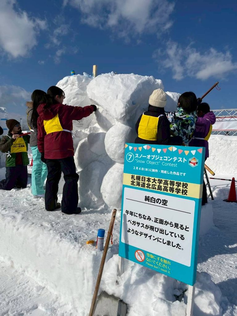 2月4日(水)、つどーむで行われたスノーオブジェコンテストに本校美術部の有志が北広島高校と協同で参加しました。極寒の中での創作活動ということで苦労もありましたが、結果は3位相当の高文連賞を受賞しました。さっぽろ雪まつり期間中展示されていますので、近くにお立ち寄りの際はぜひご覧ください。