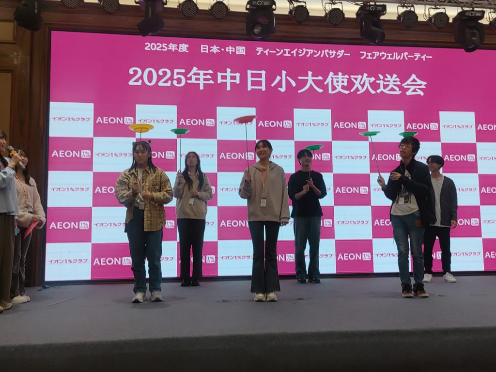 25日(6日目)には本プログラムの締めくくりとなるフェアウェルパーティーに参加しました。ここで生徒は湖南省政府関係者、イオン中国法人やホストファミリーの皆様から「小大使」としての活動に賛辞を頂き、イオンワンパーセントクラブ佐々木真理子事務局長より修了証が授与されました。パフォーマンスでは本校の伝統行事である「皿回し」を披露し、会場は大いに盛り上がりました。この日、ペアの生徒とは再会を約束して北京に移動し、26日に全員無事に帰国しました。