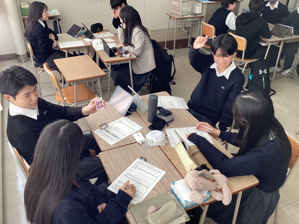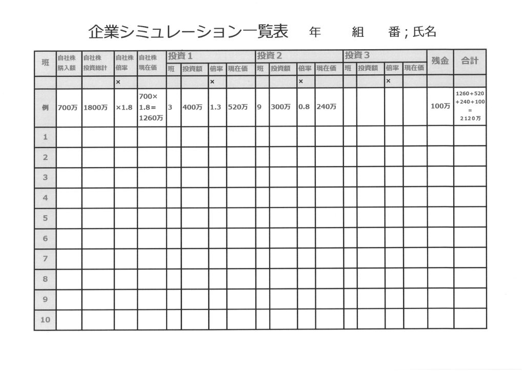 ST未来創造Ⅱ(理論編)のアントレプレナー教育の一環として、起業シミュレーションをテーマにしたワークショップを行いました。クラスを9つのグループに分け、各グループが新規のビジネスアイデアを考えて起業するという想定で、それぞれのグループが自社の新規性や強みなどをクラス全体にプレゼンします。その後、各社1500万円の自己資金を保持しているという設定で自社株や有望と思われる会社の株に投資し、集まった資金によって株価を決定して各社の時価総額を競いました。