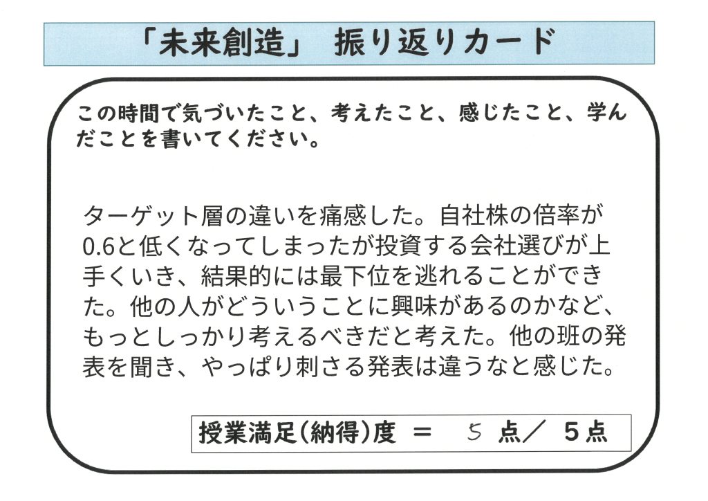 今回は、その日の体調や気分をAIに伝えるとAIがラーメンスープを調合するという株式会社「未来のラーメン屋」が人気を集めました。「来店するたびにその人の好みを学び、行くたびに自分好みのラーメンになっていく」というアピールが良かったようです。 振り返りでは、「株式のしくみを通して社会を少し実感することができた」などの声がありました。