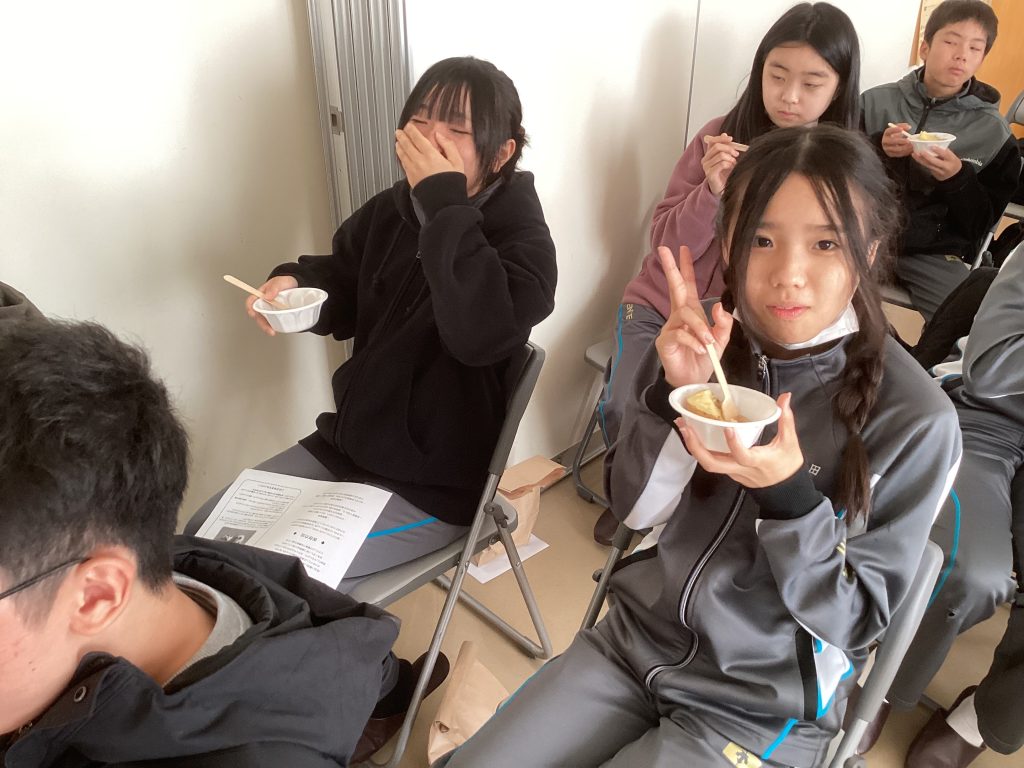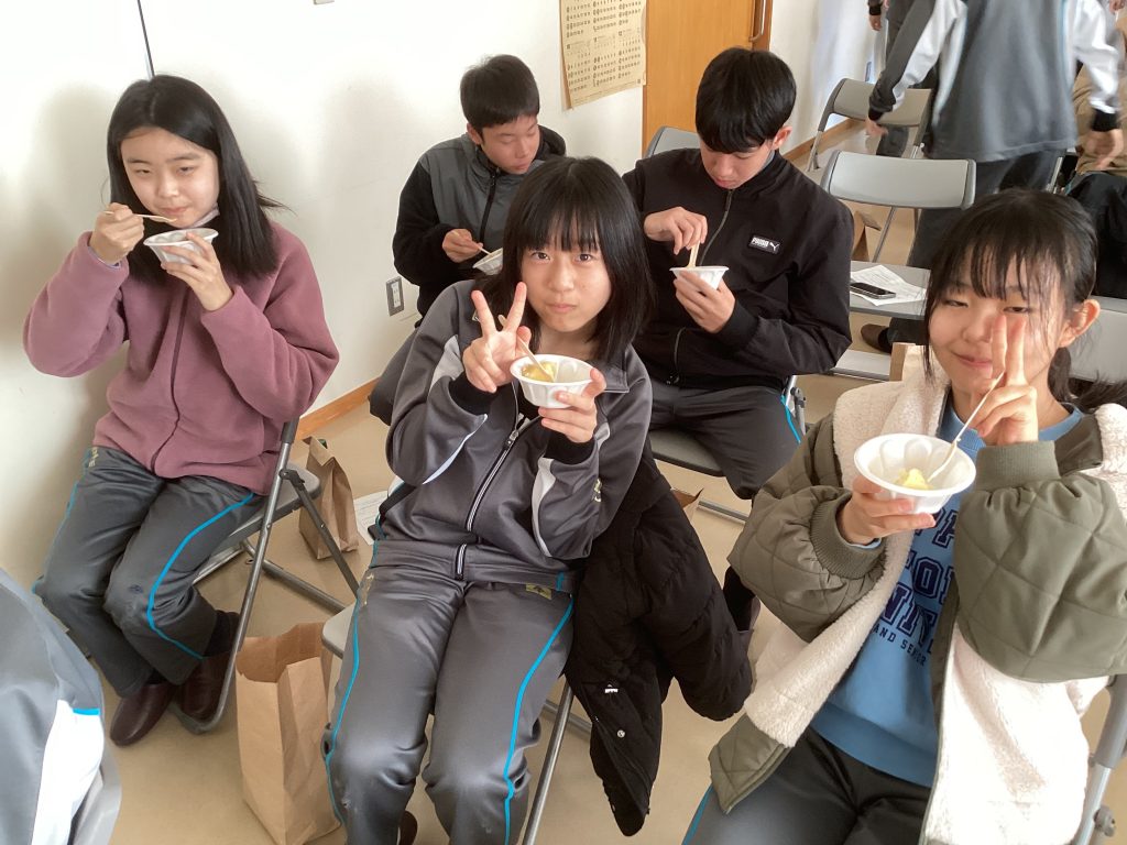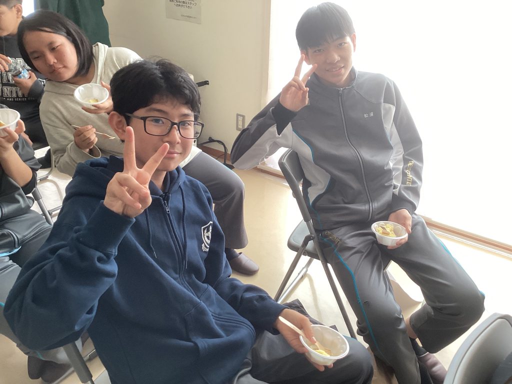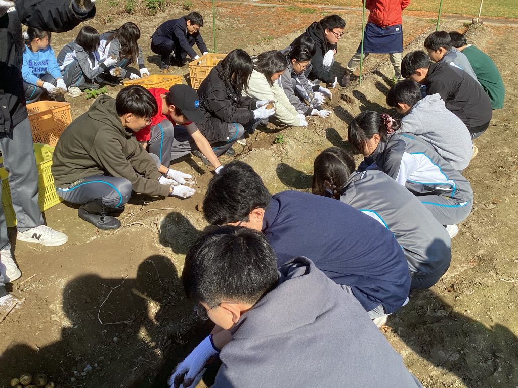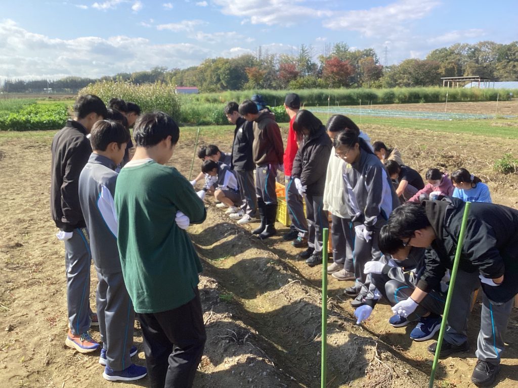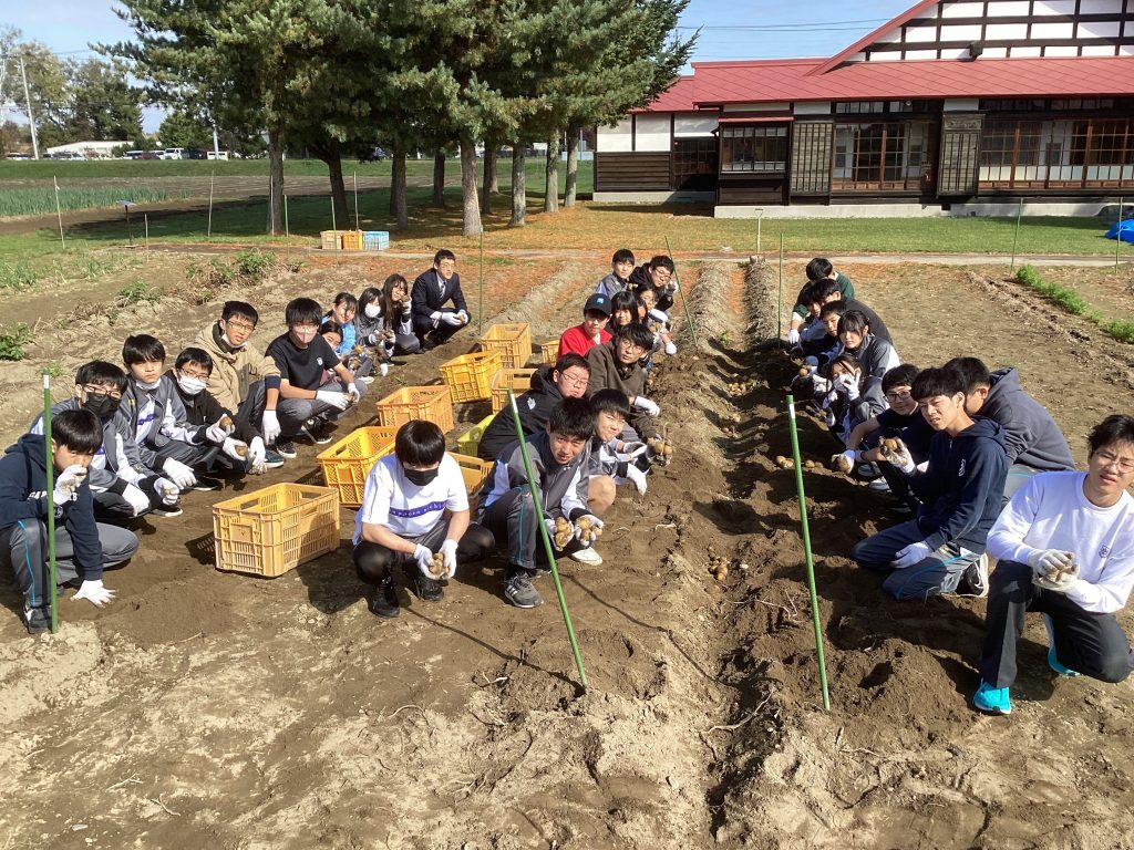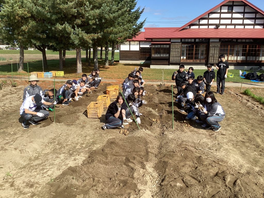 皆、両手で畑の土を掘り返し、いろいろな形のじゃがいもを次々に収穫しました。今年は高温の日が多かったこともあり不作だったそうですが、大きなじゃがいもを掘り当てるたびに誇らしそうな表情を浮かべ、収穫の喜びを実感していました。