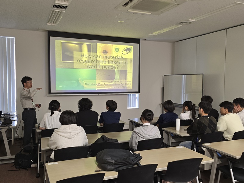 3日目となるこの日は、午前中に北海道大学大学院生命科学院転成ソフトマター研究室の黒川孝幸教授を訪ね、ゲルの最新研究について学ぶとともに、研究室の実験機材や実験方法についての説明を受けました。世界の食糧不足の解決に開発中のゲルを使う構想を聞き、とても刺激を受けると共に、新たな視点を学ぶことができました。