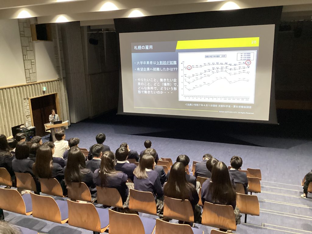 12月12日(金)6時間目、本校N Linkにおいて、高校3年生総合進学コースの生徒を対象に、札幌市経済観光局経営支援・雇用労働担当部の高久真美子様をお招きして札幌市の経済・就職についての講演会を開催しました。生徒たちは北海道や札幌市の良さを改めて感じることができ、将来に向けて札幌の雇用やわかもの支援に関する情報をクイズ形式で興味深くお聞きすることができました。