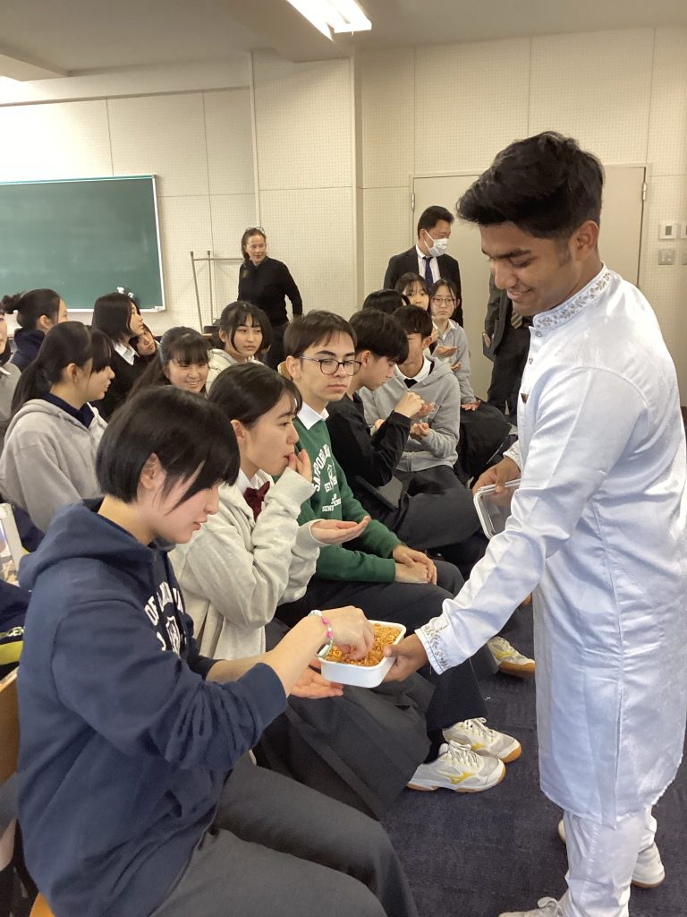 バングラデシュの伝統衣装に身を包んだImamくんは、バングラデシュの文化や言語(ベンガル語)、人々の生活についてプレゼンテーションを行い、参加者はその内容に聞き入っていました。また、現地のお菓子もふるまわれ、その美味しさ(ちょっと辛目)に驚いた様子でした。なかなか知る機会のないバングラデシュの歴史文化について学べた貴重な時間でした。こうした経験を通して国際人としての基礎を固めていってほしいと思います。