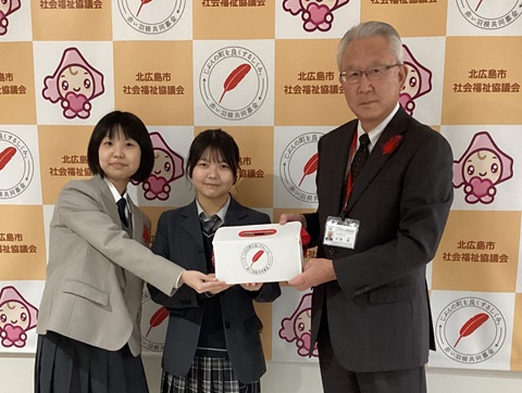 皆様からお預かりした募金は生徒を代表してボランティア部高校部部長の大山莉璃羽さんと中学部部長の布施瑠愛さんが北広島市社会福祉協議会を訪問しお届けしました。日本赤十字の共同募金を通じて、国内の福祉施設や世界各地で、紛争や自然災害、病気、食料危機などに苦しむ人々のために役立てられます。ご協力ありがとうございました。