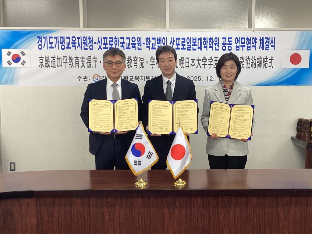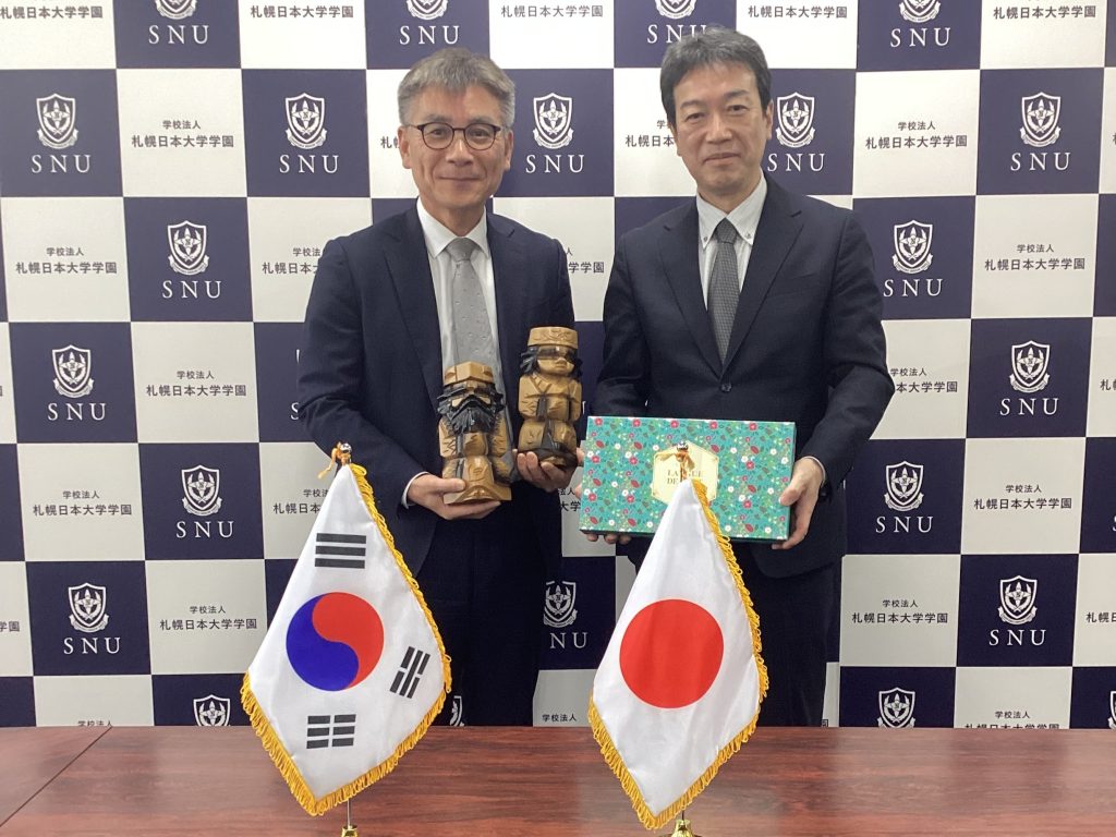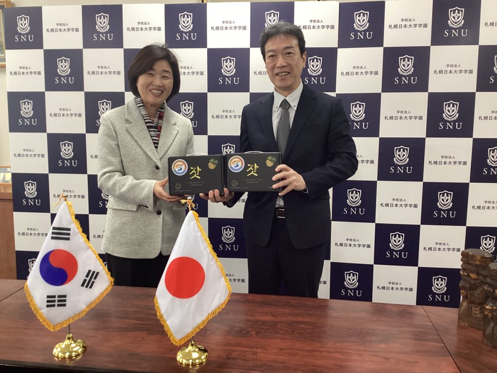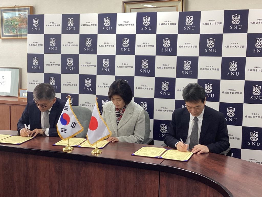 12月12日、学校法人札幌日本大学学園、韓国・京畿道加平教育支援庁、札幌韓国教育院の3者は教育協力関係の発展、未来教育の推進を目的とした国際交流を推進させる共同業務契約を締結しました。札幌日本大学学園の浅利剛之理事長、京畿道加平教育支援庁の李珽林教育長、札幌韓国教育院の朴熙喆院長がそれぞれ書類にサインし、3者の協力関係が確立されました。締結式では相互の教育状況についても情報交換され、本校の探究学習や文武両道の姿勢、国際交流の盛んさに大変興味を持たれたようでした。今後は相互の生徒間交流を中心に、日本と韓国の教育発展に向け協議と活動を進めていく予定です。