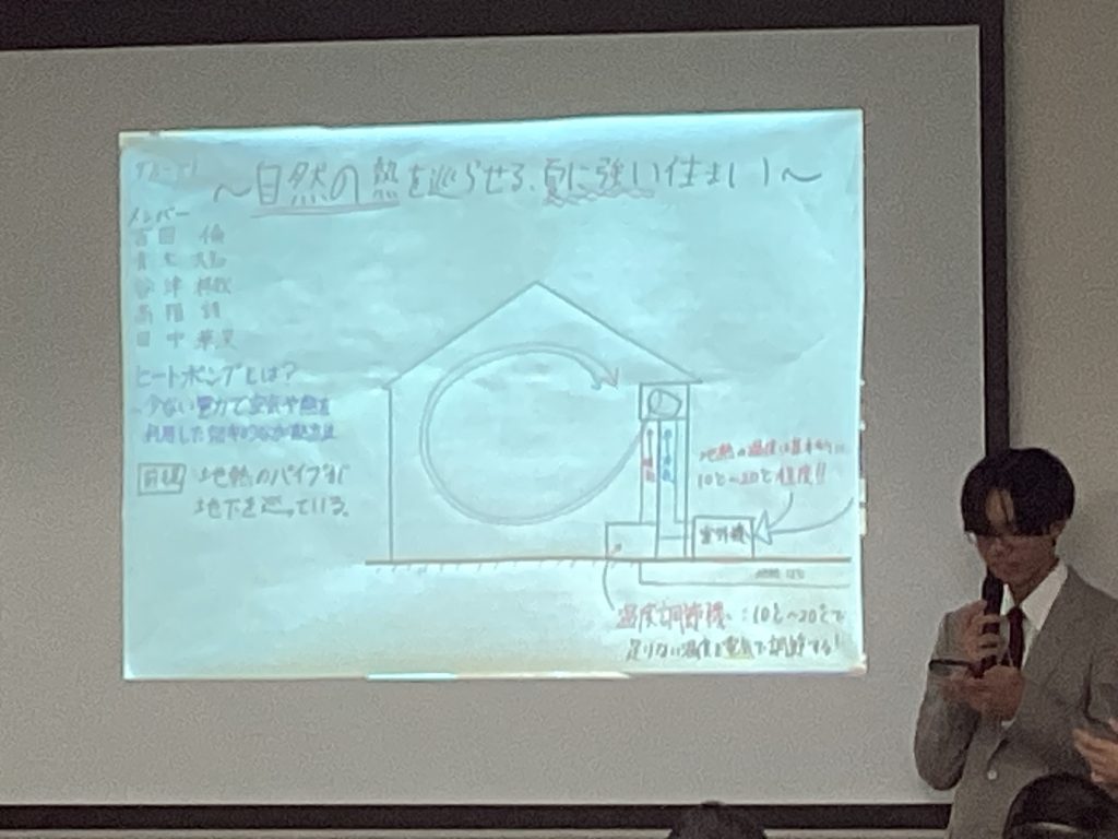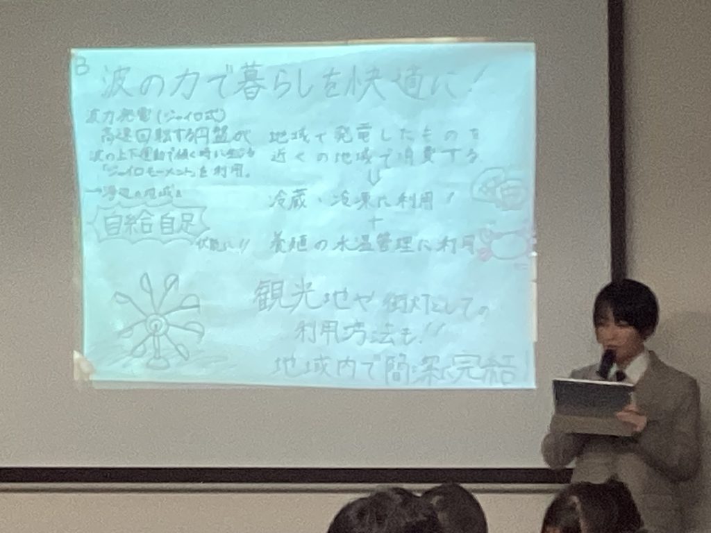 午後はワークショップ「自然とエネルギーの調和」(ピーエス工業様)に参加し、同社による植樹活動を通した仕事の歴史や効果について学んだ後、他校生徒と「自然エネルギーを活用したこれからの冷暖房」についてディスカッションし、高校生の視点から提言を行いました。