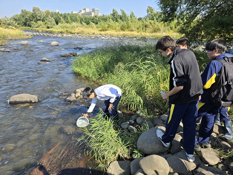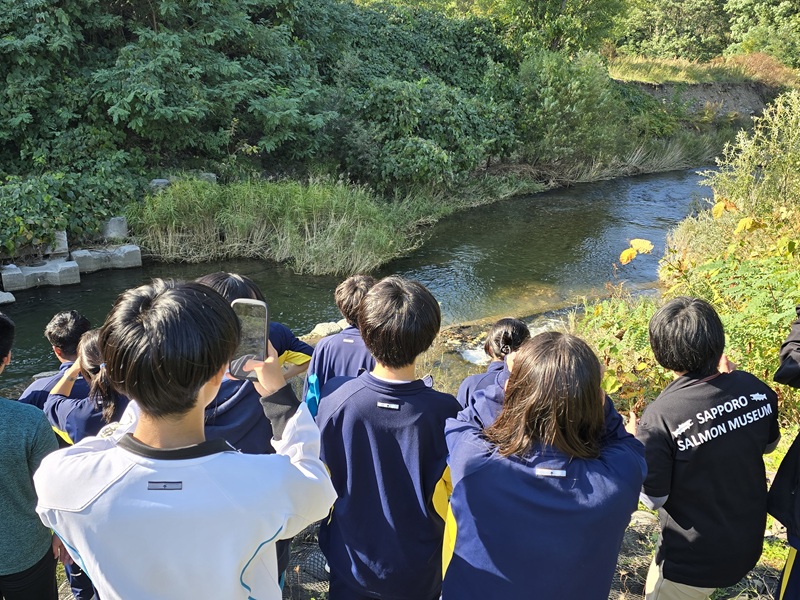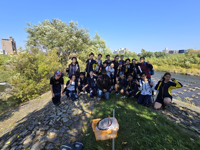 2025年10月4日(土)9:00-17:00、本校生徒18名、札幌東高校の生徒2名が参加して、「Environmental talks with future generations」のプログラムの一環としてフィールドワークを実施しました。今年度は、豊平川の水質調査を行い、さけ科学館を訪問してきました。