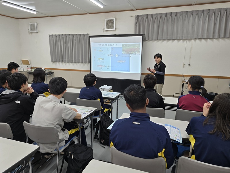さけ科学館訪問では、サクラマスがちょうど遡上していたので、その様子を観察した後、学芸員の有賀さんから、今の高校生世代は知らない1970年代の「カムバックサーモン運動」の話を聞いた後、その後の研究により明らかになってきたサケ放縦事業の課題及び現在行われている「札幌ワイルドサーモンプロジェクト」についてのお話を聞きました。お話の中で、午前中の調査で水温が低かったところは、豊平川の後期群サケ(例年10月から11月頃に遡上するサケのグループ)の産卵場所になっていて、冬期に水温が周囲に比べ高くなり仔魚の成長を早めるメリットと水質の関係による高い死亡率リスクという条件のトレードオフ関係にあるというお話を聞き、生徒たちはおおいに納得しました。