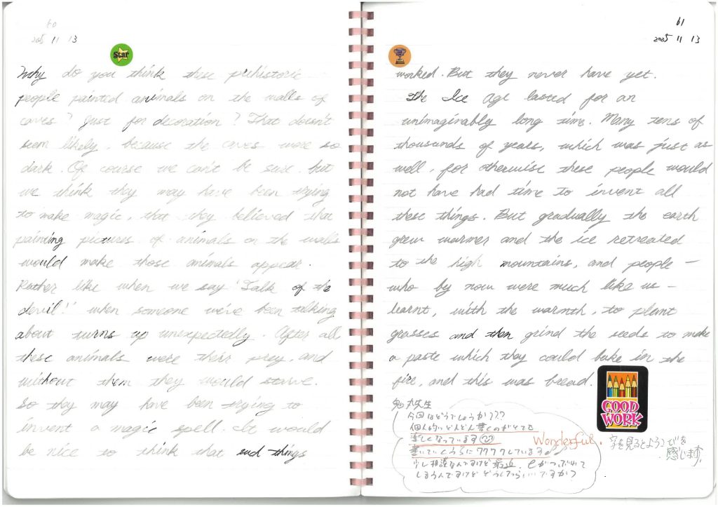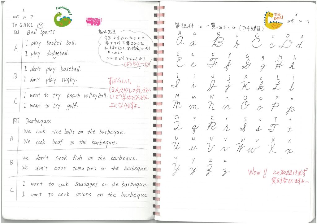 ディクテーションを続けていると、まず目に見えて変わるのが「字のきれいさ」です。書くことに向き合う時間が長くなるので、だんだんと形が整い、文字の配置も整然としてきます。国語でいえば、漢字とひらがなのバランスを使いこなせることが、日本語の美しさにつながりますよね。英語も同じで、視覚的な整い方そのものが、知識の定着とつながっていると感じます。