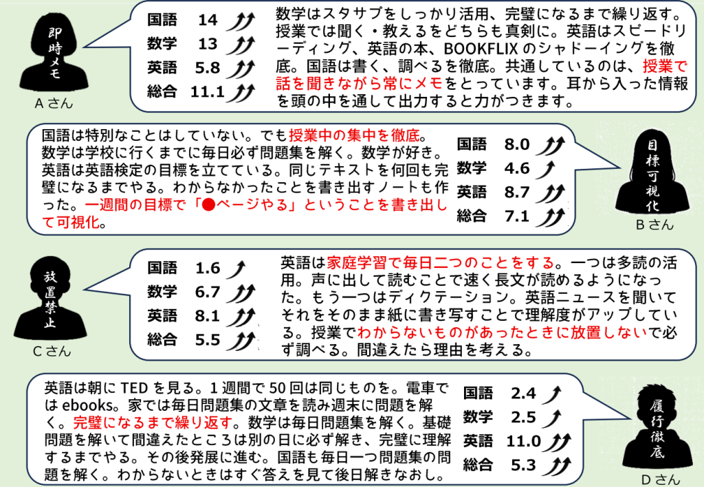 (中学1年生学年通信より抜粋)成績が向上した生徒の英語学習はそれぞれの目標や課題が設定されており、鬼丸先生の世界標準読活の影響を受けている生徒が目立つ。