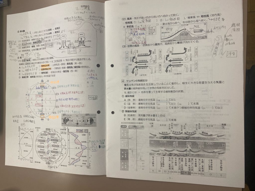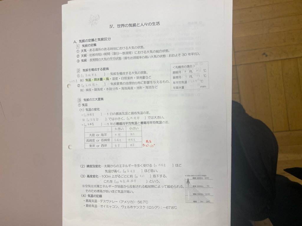 配布プリントや教科書の該当ページ(気候分野)を併用し、OPPシートの課題(大気大循環など)で理解を定着させるように指示が出ました。「地理総合」は広く概要を学ぶ科目で、「地理探究」ではより深く理論的に扱うため、双方の教材を参照し、因果を自分の言葉で説明できる力を養うことが重要であることが説明されました。受験のためだけではなく、日常や社会現象の理解に結び付ける姿勢も重要であることが伝えられました。