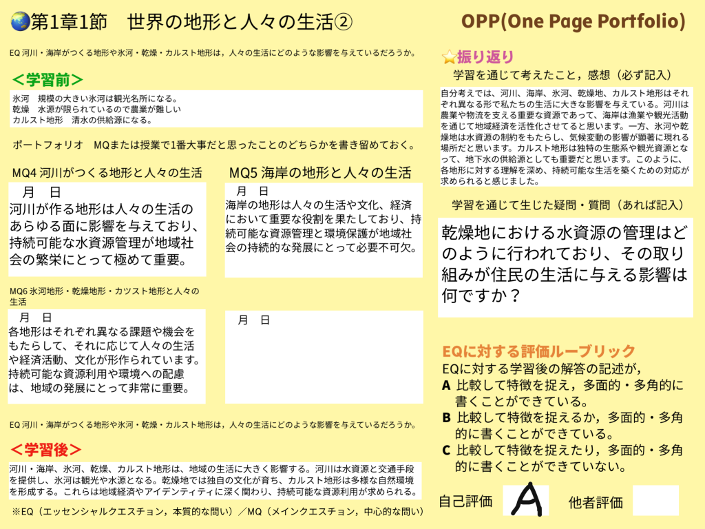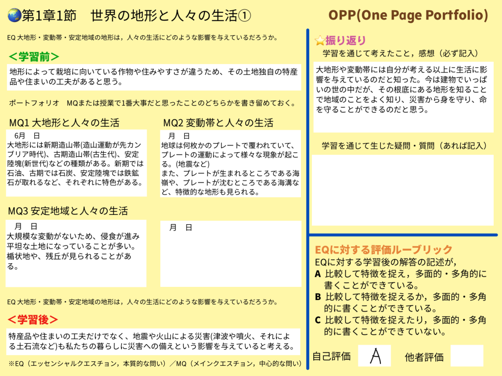 OPPシートの記入例(この画像は以前の単元で記入されたもの)