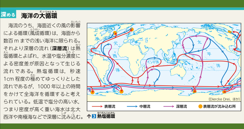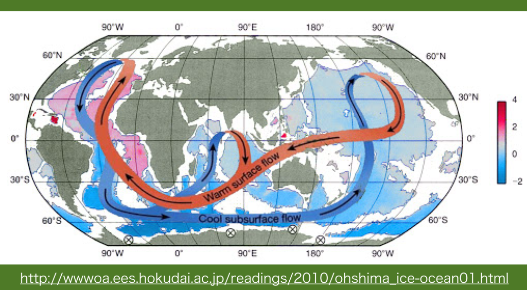 海は表層だけでなく、温度・塩分による密度差に起因する深層循環を含む「海洋大循環」を有しています。表層と深層が結びついたグローバルなコンベヤーベルトは、千年規模で地球を一周するとされます。これは大気大循環と合わせて、地球システムを理解するうえでの基礎概念であると位置づけられました。
