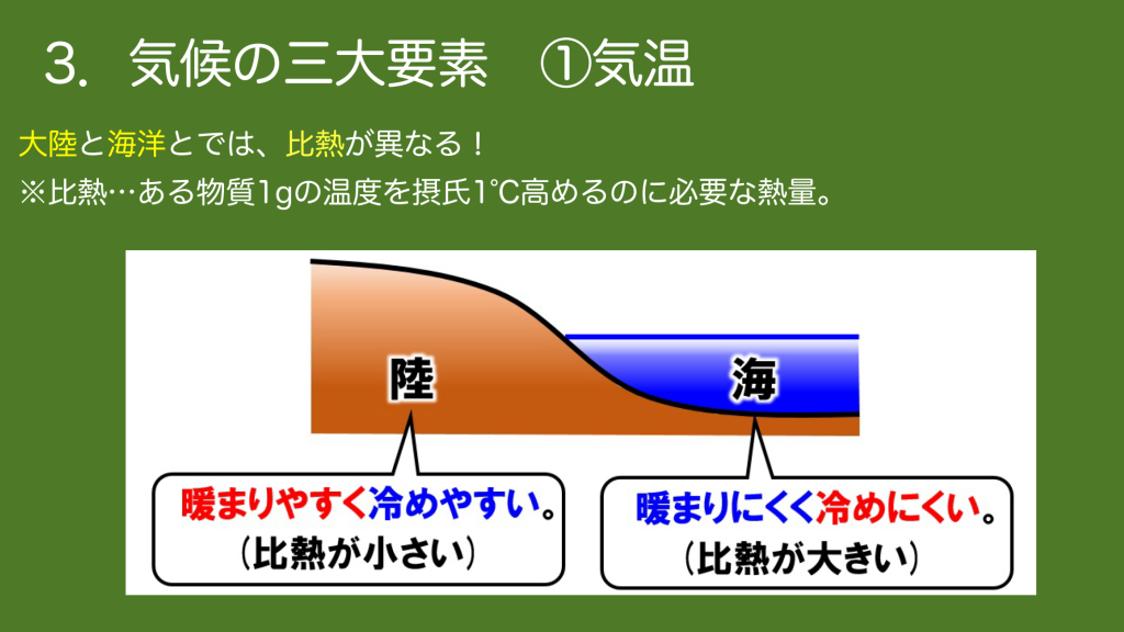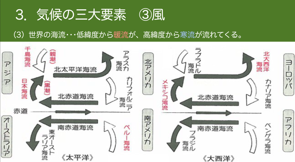 今日は前回からの続きで、もう少し先の気候まで進みたかったんですが、風や海流に関連する話で生徒の反応が良かったのでいろいろ生活に関係する話などを盛り込んでいった結果、思ったほど進めなかったなという感想です(笑)。