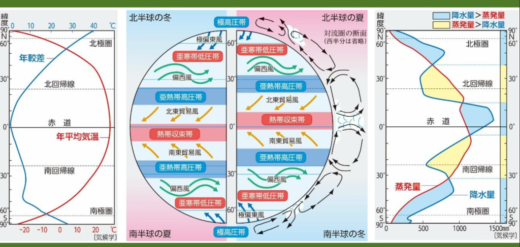 5-1)貿易風・偏西風・極偏東風と気圧帯、海流との連関。