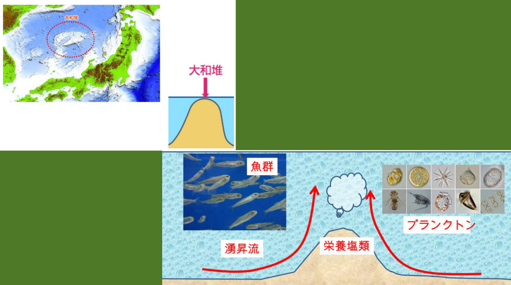 海流が交わる「潮目」では表層で水色の境が見られ、内部では「潮境」が形成されます。二水塊の衝突やせん断を契機に「湧昇流」が生じ、海底付近の栄養塩が表層に供給されます。栄養塩はプランクトンの増殖を促し、小魚、さらには大型魚へと食物連鎖が広がるため、潮目は「好漁場」になりやすいのです。また、海中の浅い高まりである「浅堆(バンク)」も、湧昇と光の到達により生産性が高まり、海藻の光合成による酸素供給や隠れ家の提供を通じて、漁獲に適した環境が整うことが伝えられました。