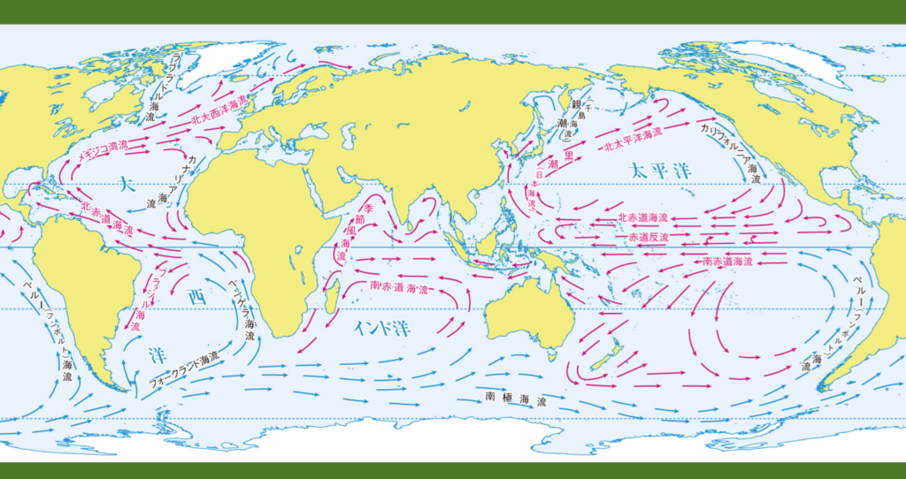 海流は暖流と寒流に大別され、赤道側など高温域からの流れが暖流、高緯度や寒冷域からの流れが寒流になります。日本周辺では、暖流の黒潮(日本海流)や対馬海流、寒流の親潮(千島海流)・リマン寒流が代表例で、世界規模では、北大西洋海流、メキシコ湾流、ペルー海流、ベンゲラ海流、カリフォルニア海流、カナリア海流などの存在が伝えられました。太平洋の北赤道海流・南赤道海流と、それらの間を東向きに流れる赤道反流も紹介し、両側の西向きの流れに対する「返し」のような逆向き流が成り立つ概念について触れていました。