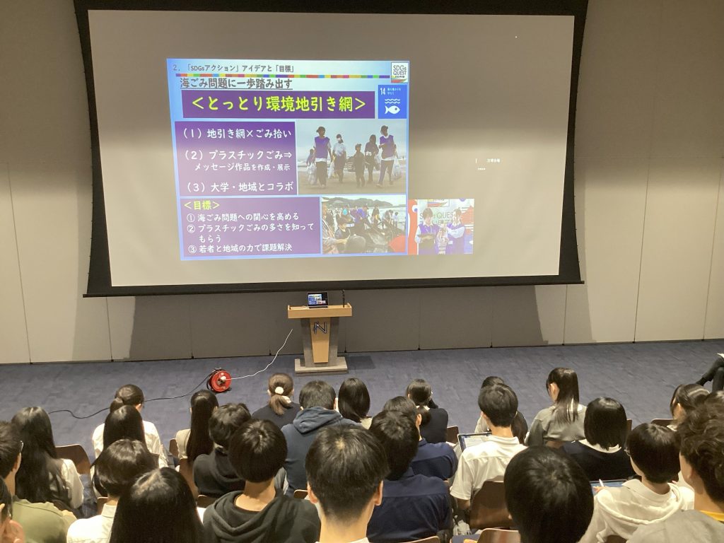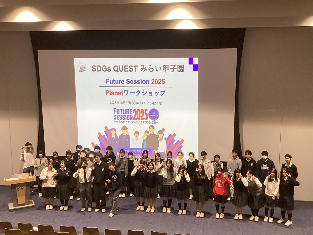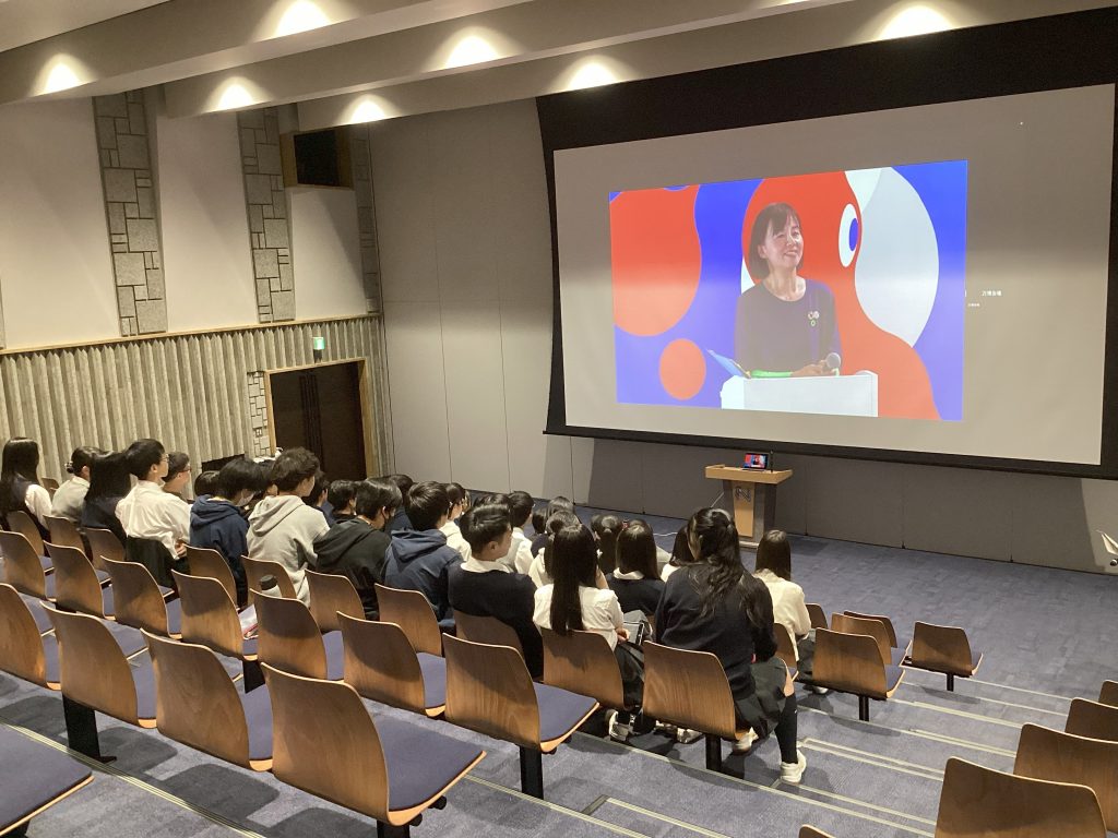 高校1年生の授業内で、大阪・関西万博会場とオンライン接続して、SDGs QUESTみらい甲子園Future Sessionにオンライン参加しました。各地方の代表高校生8チームの発表視聴し、学内で7グループに分かれて、Planet分野(気候変動・エネルギー・生物多様性など)に関する課題を自分ごととして考え、未来に向けた宣言にまとめる取り組みを行いました。